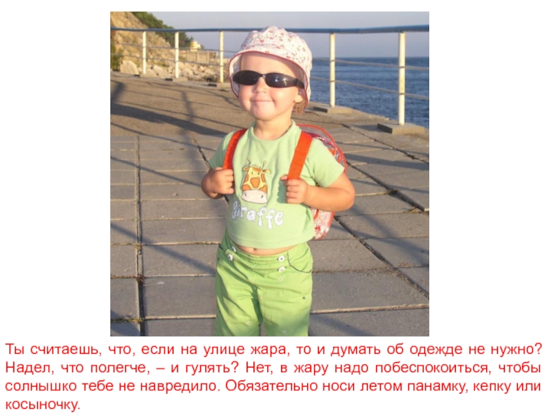 одежде не нужно? Надел, что полегче, – и гулять? Нет, в жару надо побеспокоиться, чтобы солнышко тебе не навредило. Обязательно носи летом панамку, кепку или косыночку.