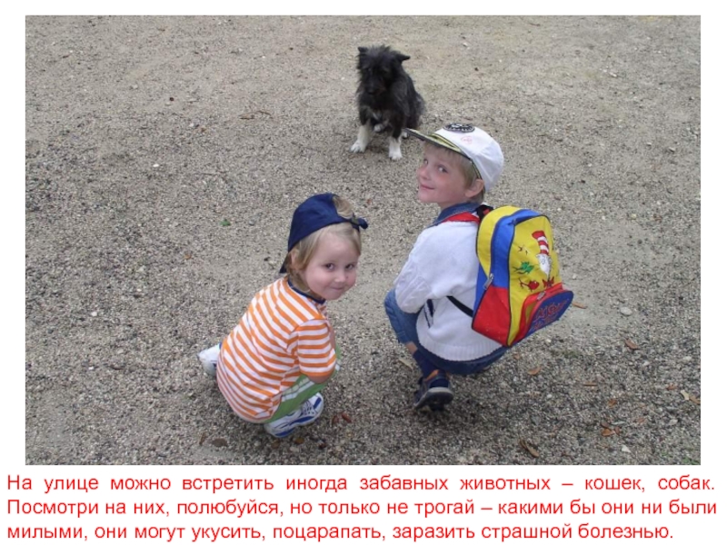 Слайд 23На улице можно встретить иногда забавных животных – кошек, собак. Посмотри