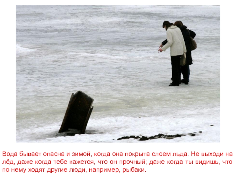Слайд 22Вода бывает опасна и зимой, когда она покрыта слоем льда. Не