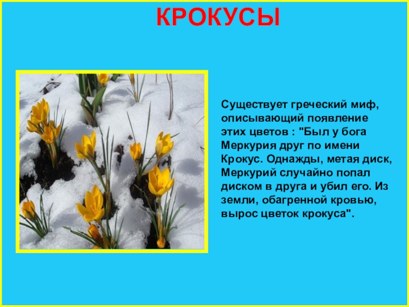 Существует греческий миф, описывающий появление этих цветов : "Был у бога Меркурия друг по имени Крокус. Однажды, метая диск, Меркурий случайно попал диском в друга и убил его. Из земли, обагренной кровью, вырос цветок крокуса".