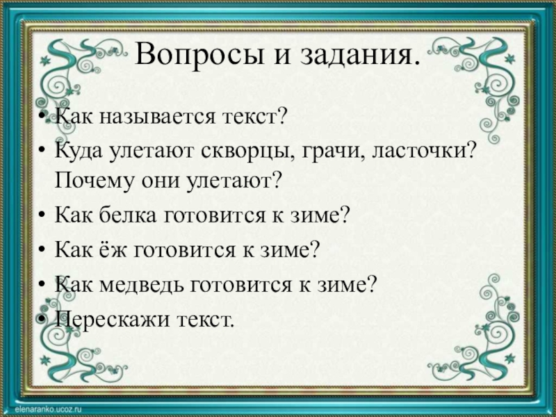 Вопросы и задания.Как называется текст?Куда улетают скворцы, грачи, ласточки? Почему они улетают?Как белка готовится к зиме?Как ёж