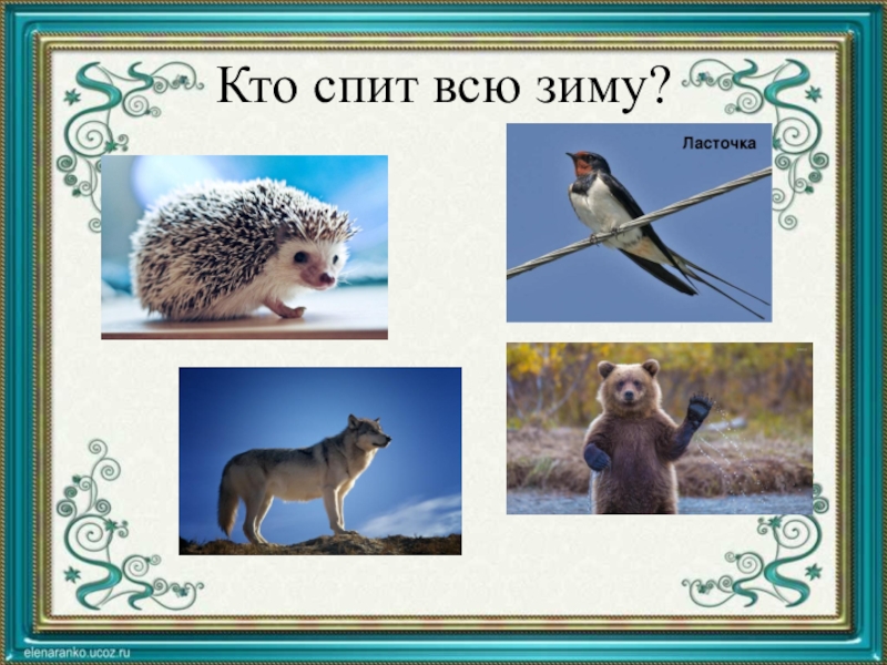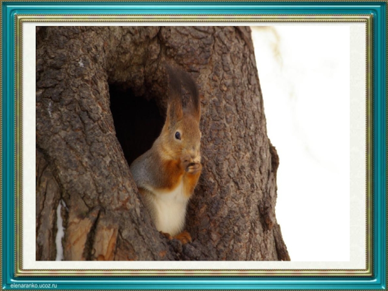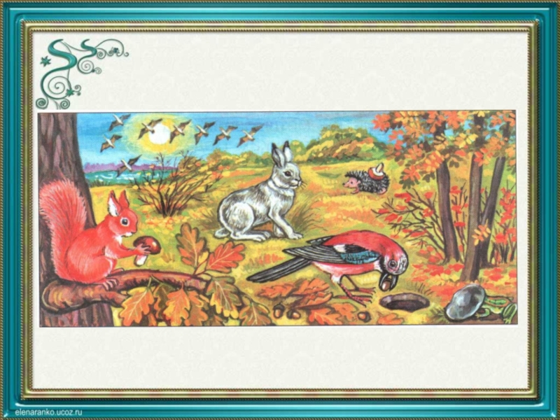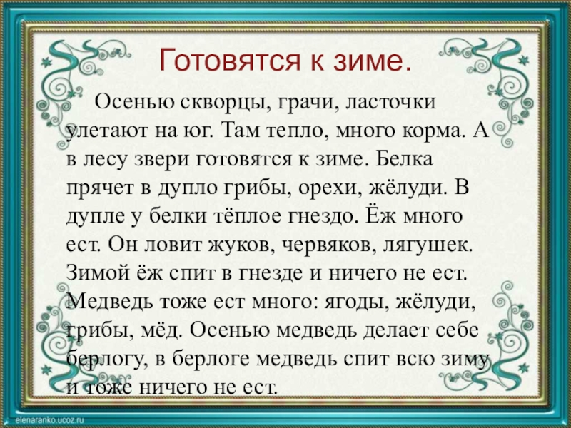 Готовятся к зиме.Осенью скворцы, грачи, ласточки улетают на юг. Там тепло, много корма. А в лесу звери готовятся к зиме. Белка прячет в дупло грибы, орехи, жёлуди. В дупле у белки тёплое гнездо. Ёж много ест.