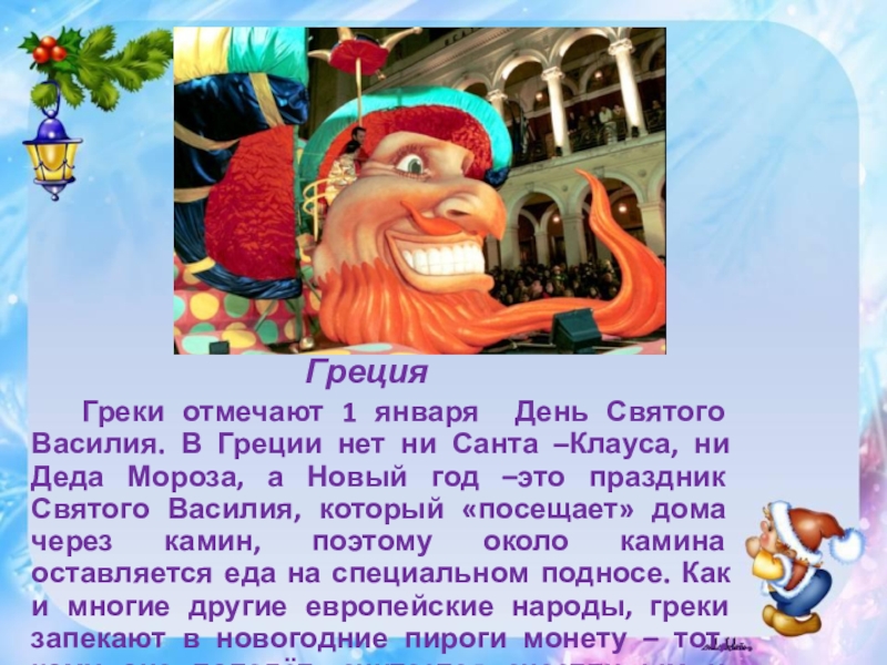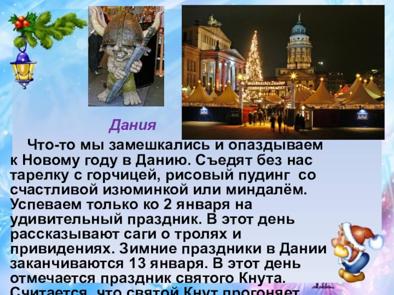 Все дети Швеции целый год собирают ненужную посуду, чтобы в канун Нового года разбить её о порог дома. Чем больше черепков, тем лучше. Разбить тарелку – на счастье.