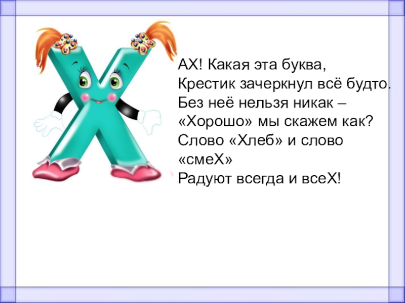 АХ! Какая эта буква,Крестик зачеркнул всё будто.Без неё нельзя никак –«Хорошо» мы скажем как?Слово «Хлеб» и слово