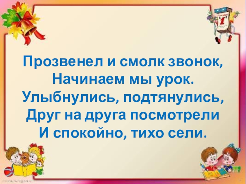 Слайд 2 Прозвенел и смолк звонок, Начинаем мы урок. Улыбнулись, подтянулись, Друг на друга посмотрели И спокойно,