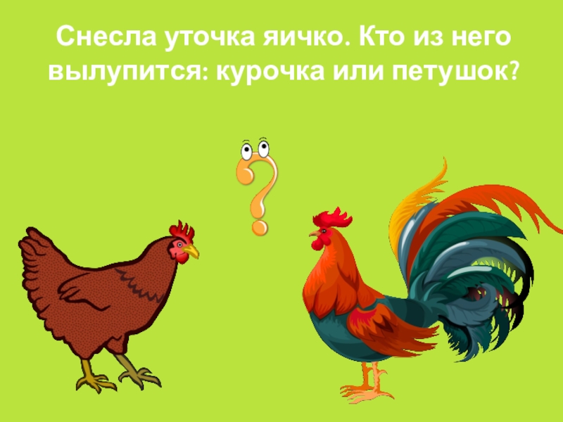 Слайд 5Снесла уточка яичко. Кто из него вылупится: курочка или петушок?