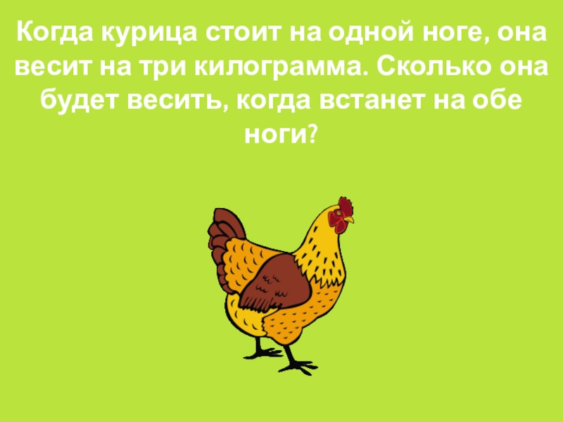 Когда курица стоит на одной ноге, она весит на три килограмма. Сколько она будет весить, когда встанет