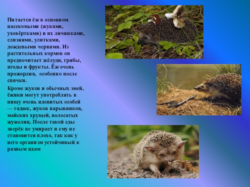 Слайд 5Питается ёж в основном насекомыми (жуками, уховёртками) и их личинками, слизнями,
