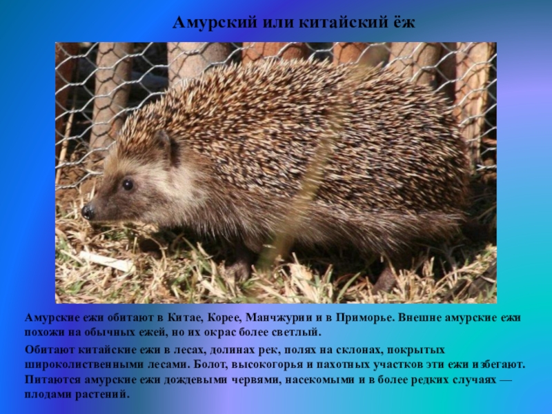 в Приморье. Внешне амурские ежи похожи на обычных ежей, но их окрас более светлый.