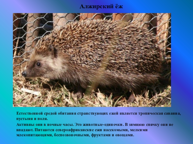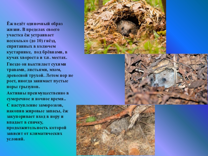 Слайд 4Ёж ведёт одиночный образ жизни. В пределах своего участка ёж устраивает