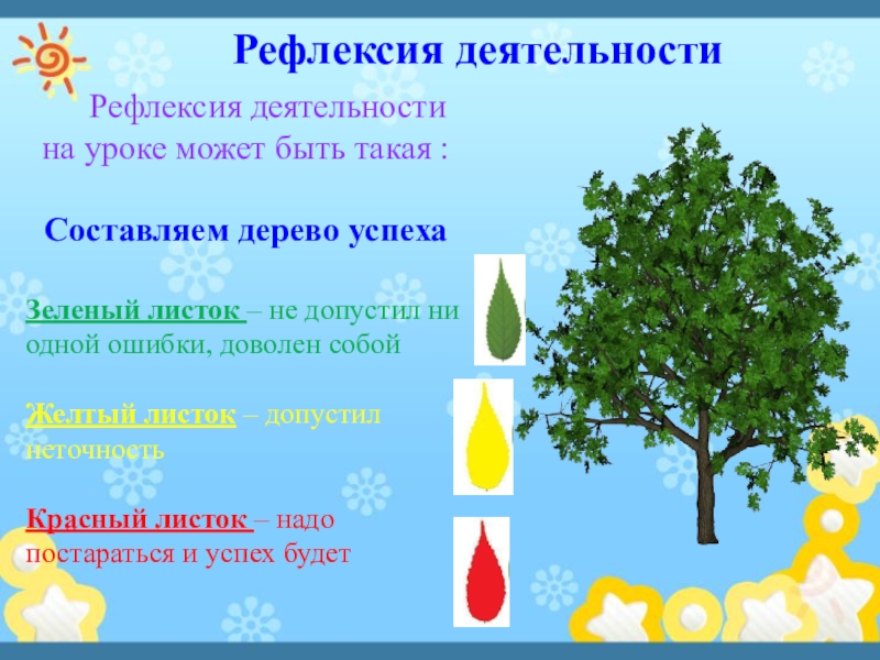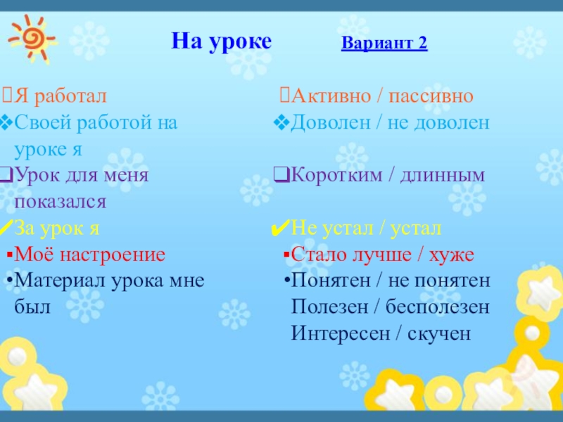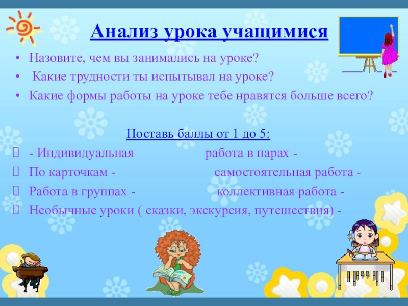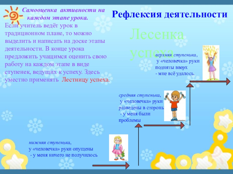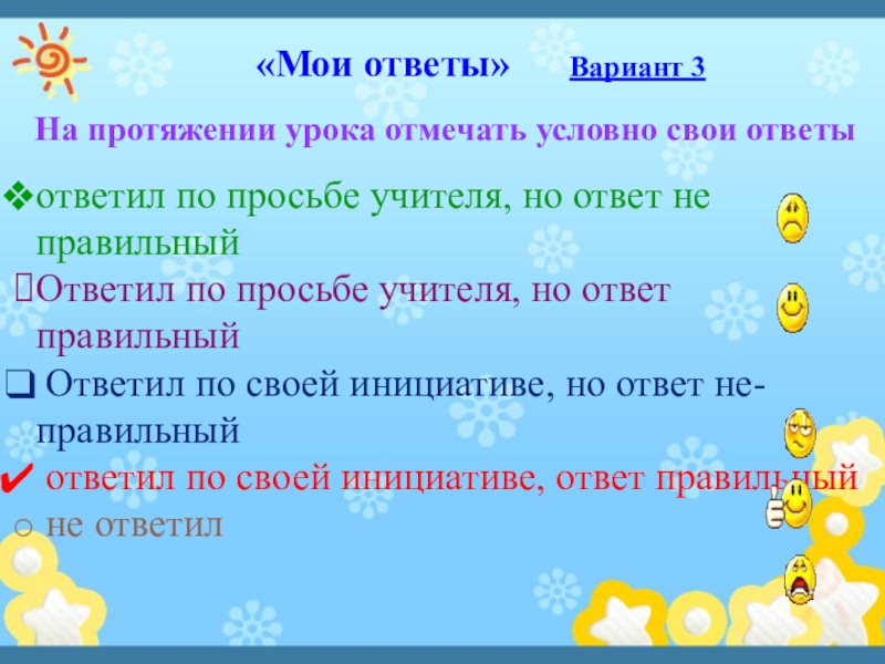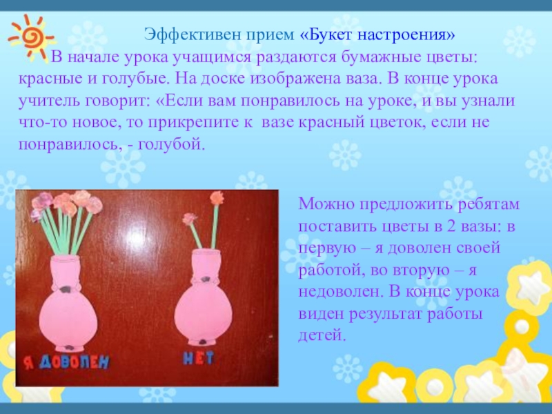 Можно предложить ребятам поставить цветы в 2 вазы: в первую – я доволен своей работой, во вторую – я недоволен. В конце урока виден результат работы детей.