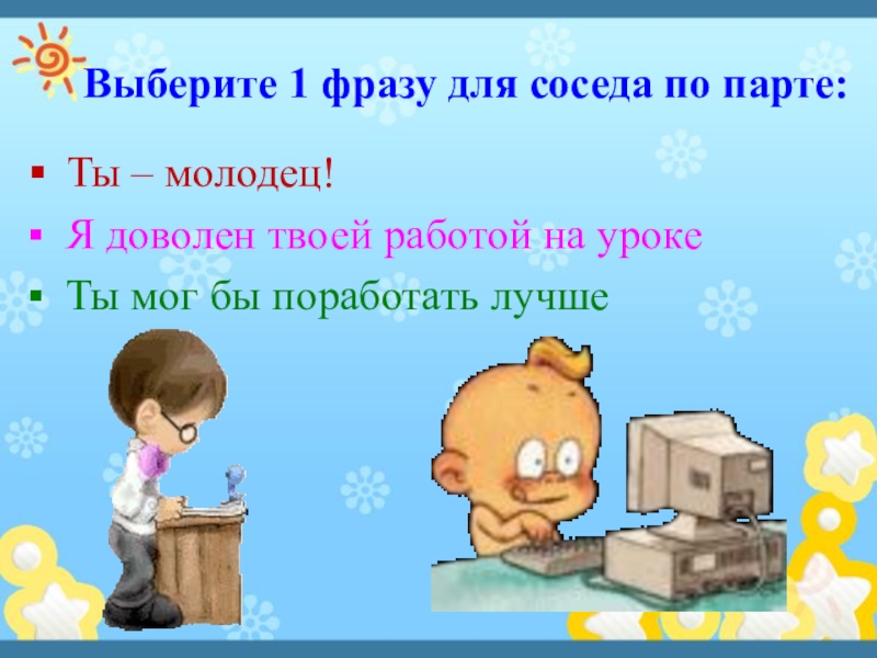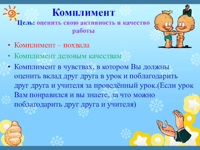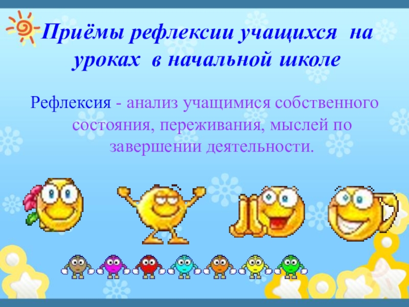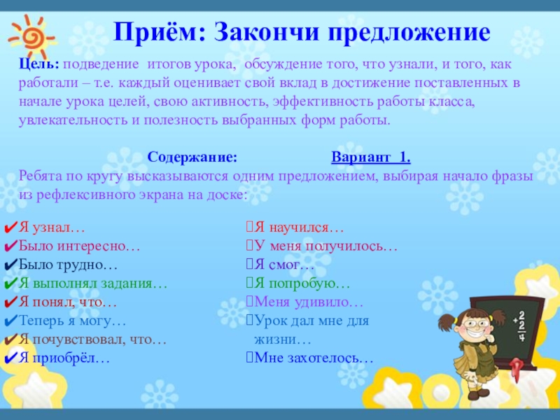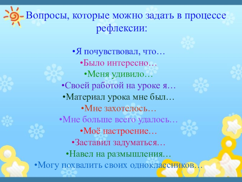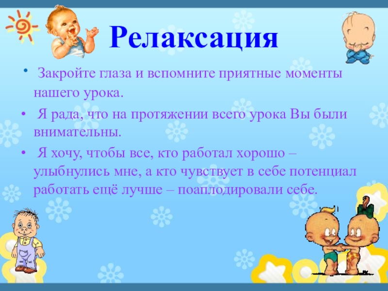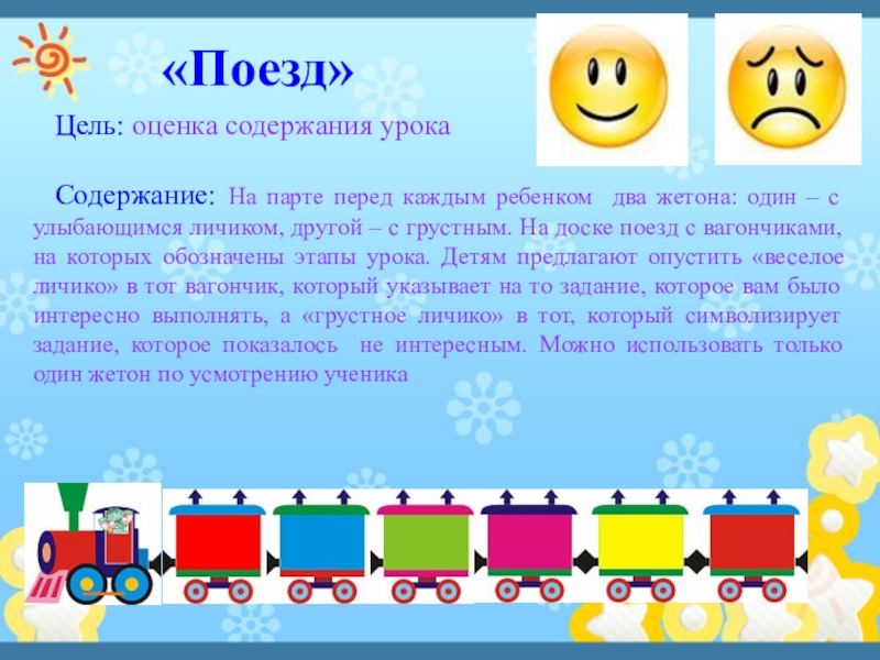 Можно предложить ребятам поставить цветы в 2 вазы: в первую – я доволен своей работой, во вторую – я недоволен. В конце урока виден результат работы детей.