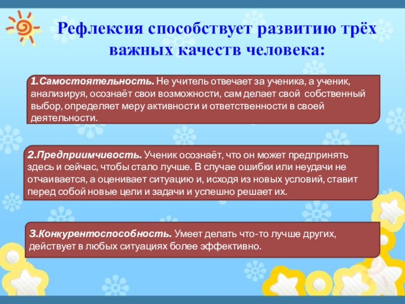 2.Предприимчивость. Ученик осознаёт, что он может предпринять здесь и сейчас, чтобы стало лучше. В случае ошибки или неудачи не отчаивается, а оценивает ситуацию и, исходя из новых условий, ставит перед собой новые цели и задачи и успешно решает их.