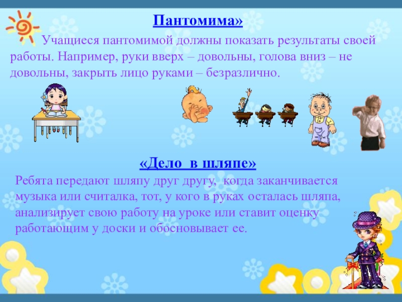 Ребята передают шляпу друг другу, когда заканчивается музыка или считалка, тот, у кого в руках осталась шляпа, анализирует свою работу на уроке или ставит оценку работающим у доски и обосновывает ее.