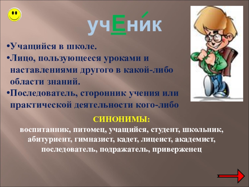 воспитанник, питомец, учащийся, студент, школьник, абитуриент, гимназист, кадет, лицеист, академист, последователь, подражатель, приверженец
