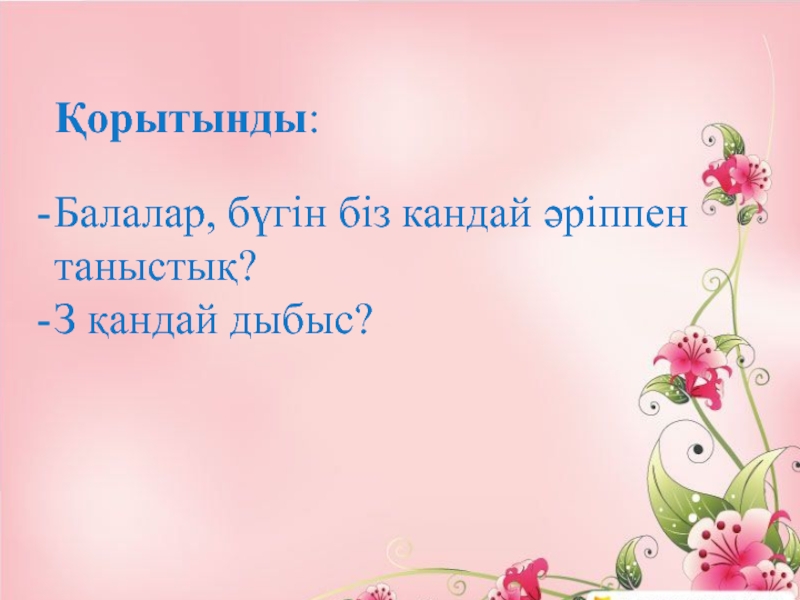 Балалар, бүгін біз кандай әріппен таныстық?З қандай дыбыс?Қорытынды:
