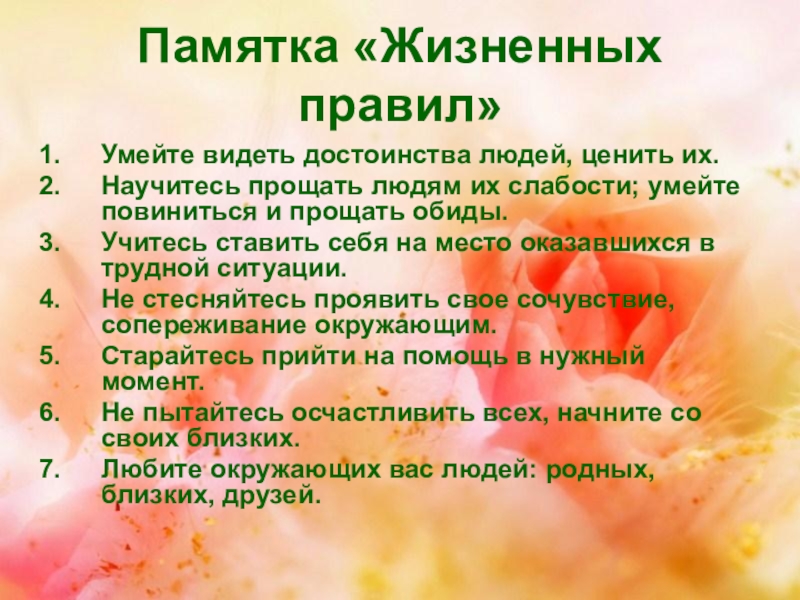 Памятка «Жизненных правил»Умейте видеть достоинства людей, ценить их.Научитесь прощать людям их слабости; умейте повиниться и прощать обиды.Учитесь