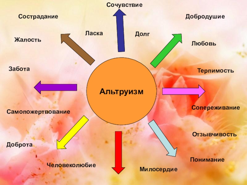 АльтруизмСостраданиеСочувствиеДобродушие ТерпимостьСопереживаниеОтзывчивостьМилосердиеПониманиеСамопожертвованиеЗаботаДобротаЛюбовьЖалостьДолгЛаскаЧеловеколюбие