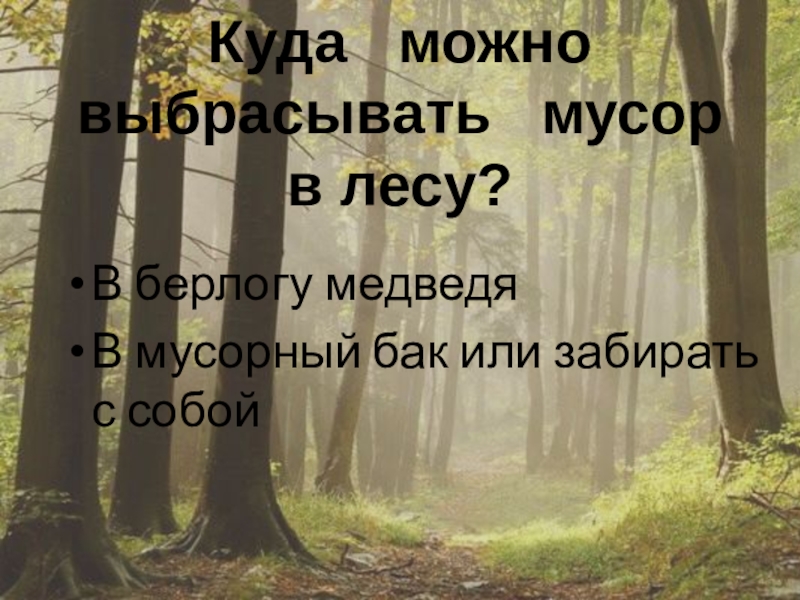 Слайд 18Куда можно выбрасывать мусор в лесу?