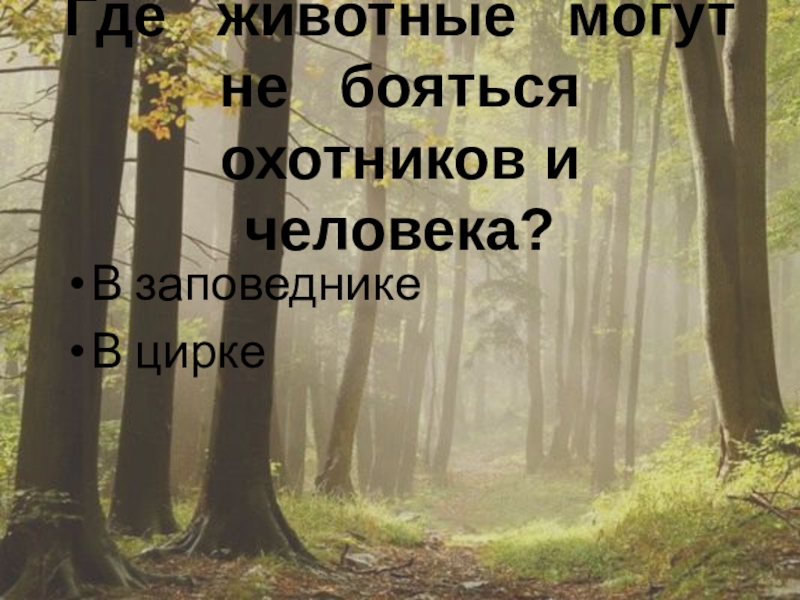Где  животные  могут  не  бояться  охотников и  человека?В заповедникеВ цирке