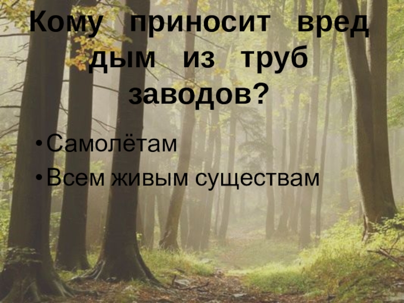 Кому  приносит  вред дым  из  труб  заводов?СамолётамВсем живым существам