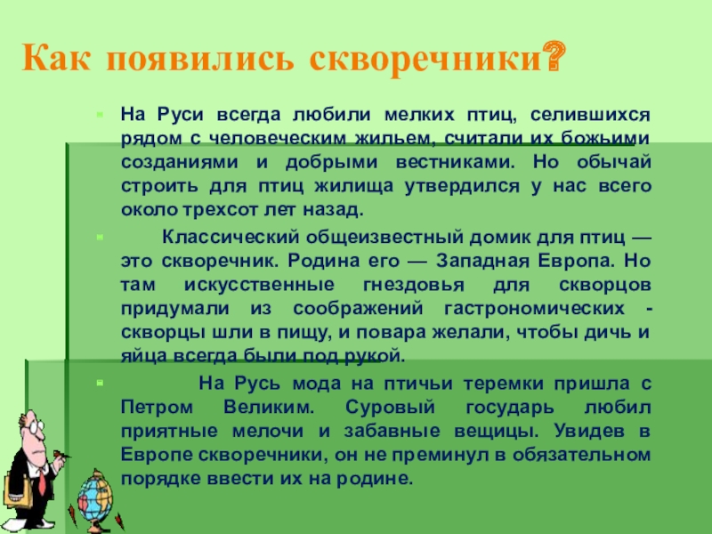 На Руси всегда любили мелких птиц, селившихся рядом с человеческим жильем, считали их божьими созданиями и добрыми вестниками. Но обычай строить для птиц жилища утвердился у нас всего около трехсот лет назад.