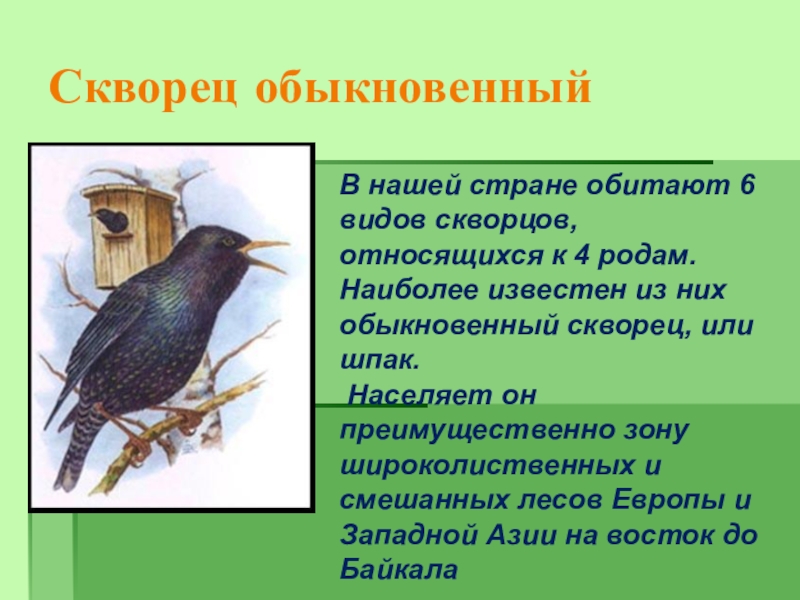 Классический общеизвестный домик для птиц — это скворечник. Родина его — Западная Европа. Но там искусственные гнездовья для скворцов придумали из соображений гастрономических - скворцы шли в пищу, и повара желали, чтобы дичь и яйца всегда были под рукой.