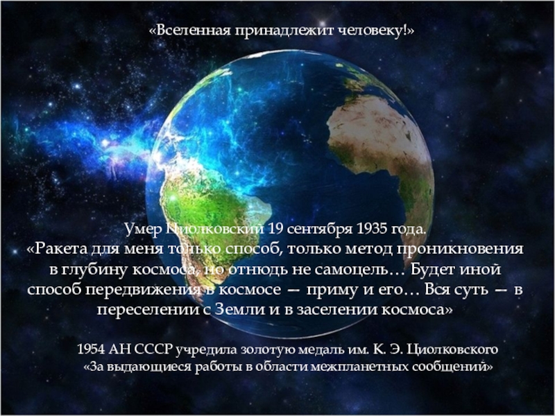 только метод проникновения в глубину космоса, но отнюдь не самоцель… Будет иной способ передвижения в космосе — приму и его… Вся суть — в переселении с Земли и в заселении космоса»