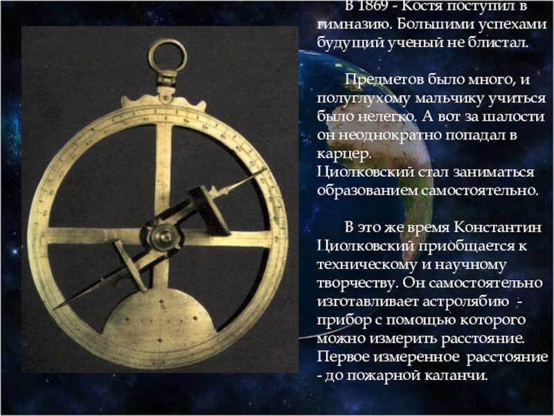 В это же время Константин Циолковский приобщается к техническому и научному творчеству. Он самостоятельно изготавливает астролябию - прибор с помощью которого можно измерить расстояние. Первое измеренное расстояние - до пожарной каланчи.