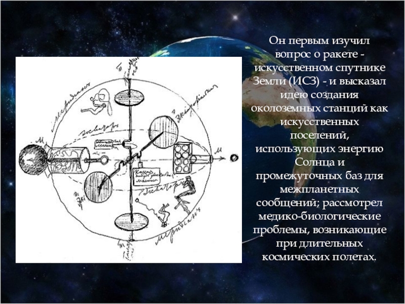 - и высказал идею создания околоземных станций как искусственных поселений, использующих энергию Солнца и промежуточных баз для межпланетных сообщений; рассмотрел медико-биологические проблемы, возникающие при длительных космических полетах.
