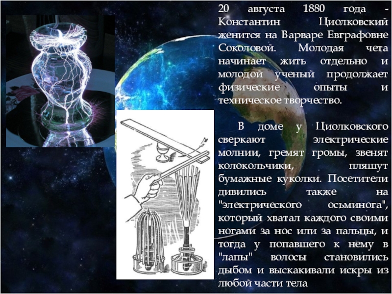 В доме у Циолковского сверкают электрические молнии, гремят громы, звенят колокольчики, пляшут бумажные куколки. Посетители дивились также на "электрического осьминога", который хватал каждого своими ногами за нос или за пальцы, и тогда у попавшего к нему в "лапы" волосы становились дыбом и выскакивали искры из любой части тела