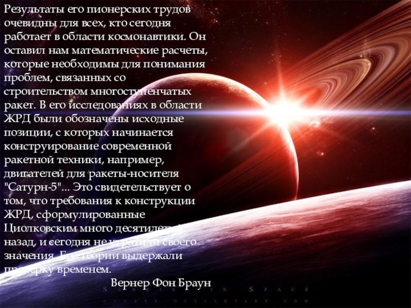 области космонавтики. Он оставил нам математические расчеты, которые необходимы для понимания проблем, связанных со строительством многоступенчатых ракет. В его исследованиях в области ЖРД были обозначены исходные позиции, с которых начинается конструирование современной ракетной техники, например, двигателей для ракеты-носителя "Сатурн-5"... Это свидетельствует о том, что требования к конструкции ЖРД, сформулированные Циолковским много десятилетий назад, и сегодня не утратили своего значения. Его теории выдержали проверку временем.