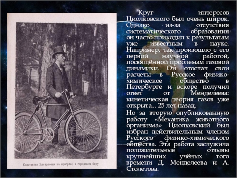 Но за вторую опубликованную работу «Механика животного организма» Циолковский был избран действительным членом Русского физико-химического общества. Эта работа заслужила положительные отзывы крупнейших учёных того времени Д. Менделеева и А. Столетова.