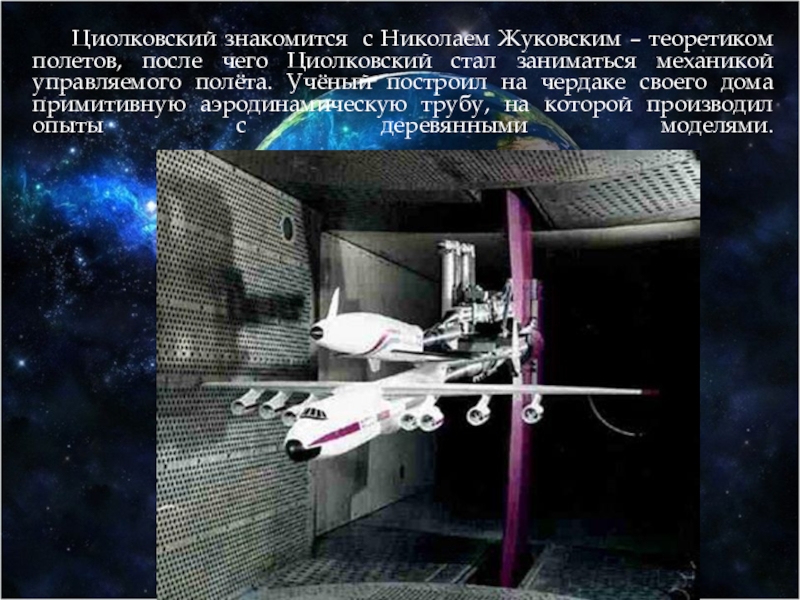 Слайд 10 Циолковский знакомится с Николаем Жуковским – теоретиком полетов, после чего Циолковский