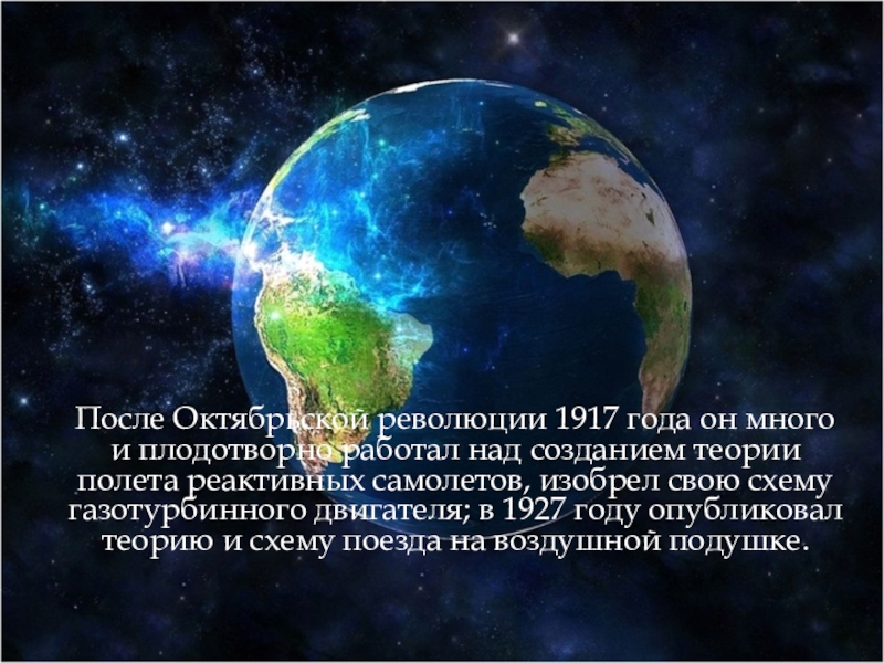 созданием теории полета реактивных самолетов, изобрел свою схему газотурбинного двигателя; в 1927 году опубликовал теорию и схему поезда на воздушной подушке.