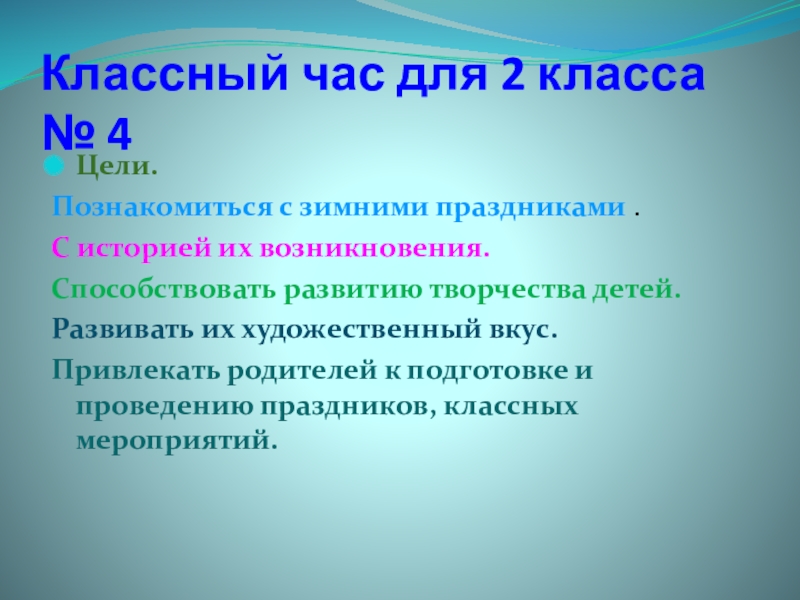 Классный час для 2 класса № 4Цели.Познакомиться с зимними праздниками .С историей их возникновения.Способствовать развитию творчества детей.Развивать их художественный вкус.Привлекать родителей к подготовке и проведению праздников, классных мероприятий.