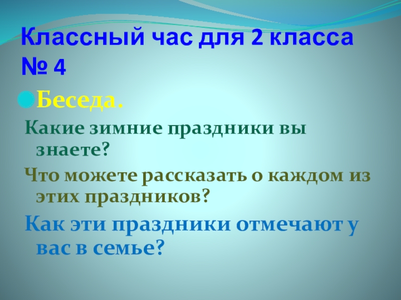 Слайд 1Классный час № 4. для 2 класса Тема: «Зимние праздники».