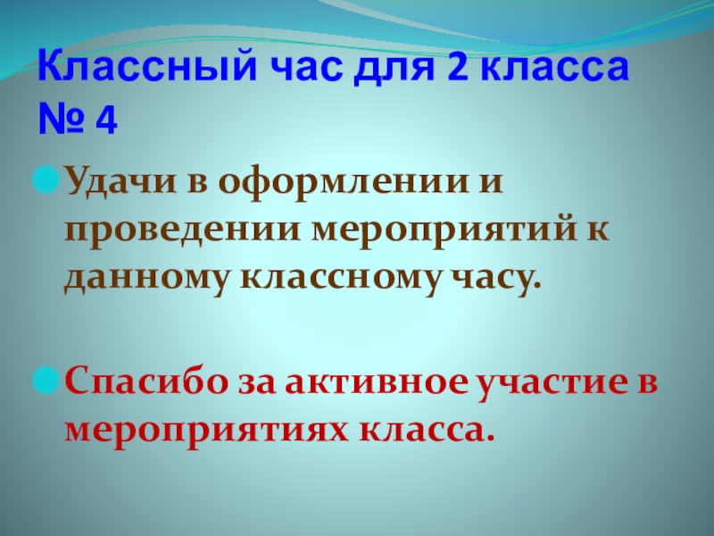 Классный час для 2 класса № 4Удачи в оформлении и проведении мероприятий к данному классному часу.Спасибо за