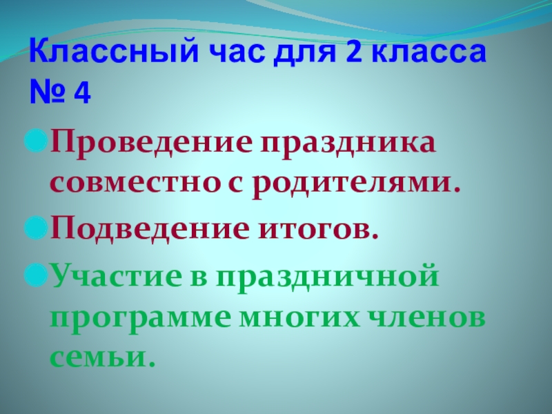 Классный час для 2 класса № 4Проведение праздника совместно с родителями.Подведение итогов.Участие в праздничной программе многих членов