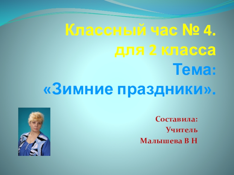 Классный час № 4. для 2 класса Тема:  «Зимние праздники».Составила:Учитель Малышева В Н