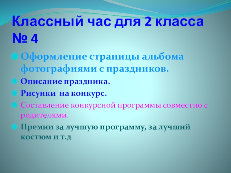 Классный час для 2 класса № 4Оформление страницы альбома фотографиями с праздников.Описание праздника.Рисунки на конкурс.Составление конкурсной программы