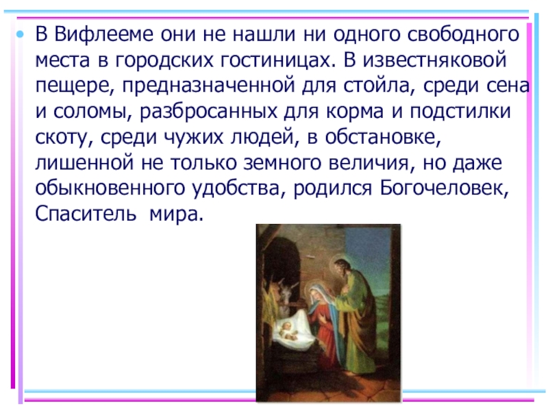 гостиницах. В известняковой пещере, предназначенной для стойла, среди сена и соломы, разбросанных для корма и подстилки скоту, среди чужих людей, в обстановке, лишенной не только земного величия, но даже обыкновенного удобства, родился Богочеловек, Спаситель мира.