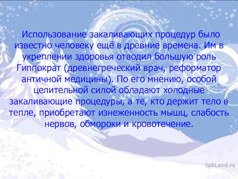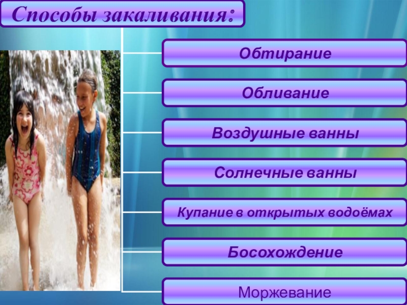 Наиболее эффективным средством закаливания является купание в открытых водоёмах. Во время купания на организм одновременно воздействует солнце, воздух и вода. Прежде чем купаться, обязательно обращайте внимание на правила безопасного поведения при купании. Купаться рекомендуется не раньше, чем через 1 – 1,5 часа после еды.