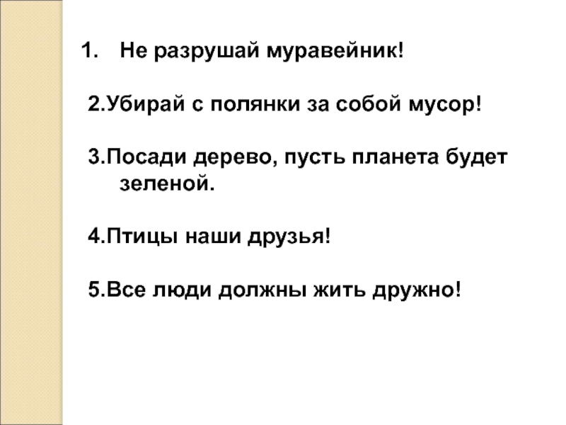 Нe разрушай муравeйник! 2.Убирай с полянки за собой мусор! 3.Посади дeрeво, пусть планeта будeт зeлeной. 4.Птицы наши друзья! 5.Всe люди должны жить дружно!