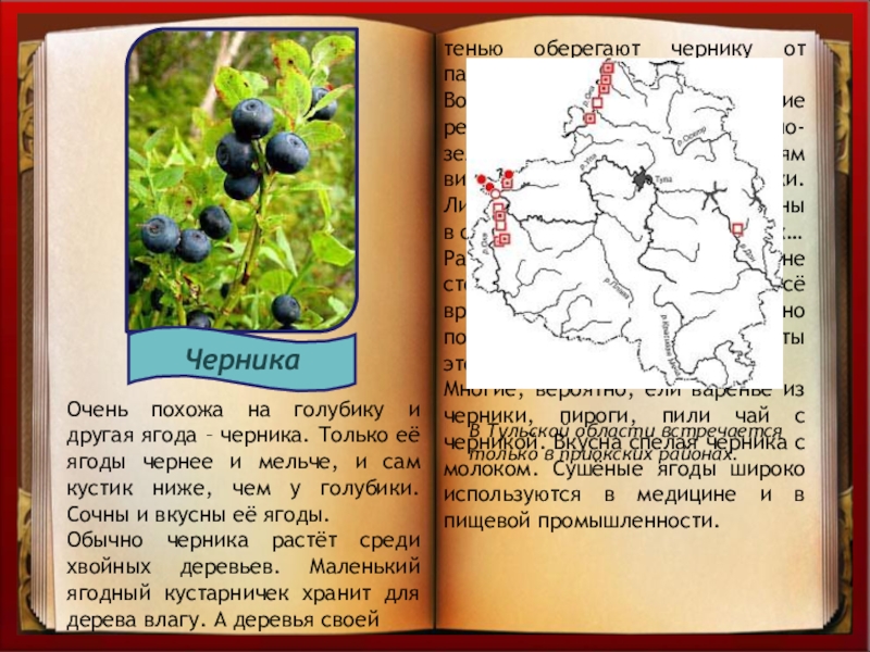 В мшистом хвойном лесу или на торфяном болоте, заглянув под твёрдые листики ветвистого кустарничка, вы откроете голубое «море»: сотни и тысячи голубых ягод расположились под плотными листочками. Эти ягоды так и называются – «голубика».