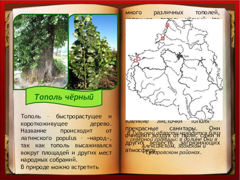 Тополь используется при создании защитных посадок вокруг промышленных предприя-тий, вдоль транспортных и железнодорожных магистралей, по берегам рек и каналов. Клейкие листочки тополя – прекрасные санитары. Они очищают воздух от пыли, сажи и других веществ, загрязняющих атмосферу.