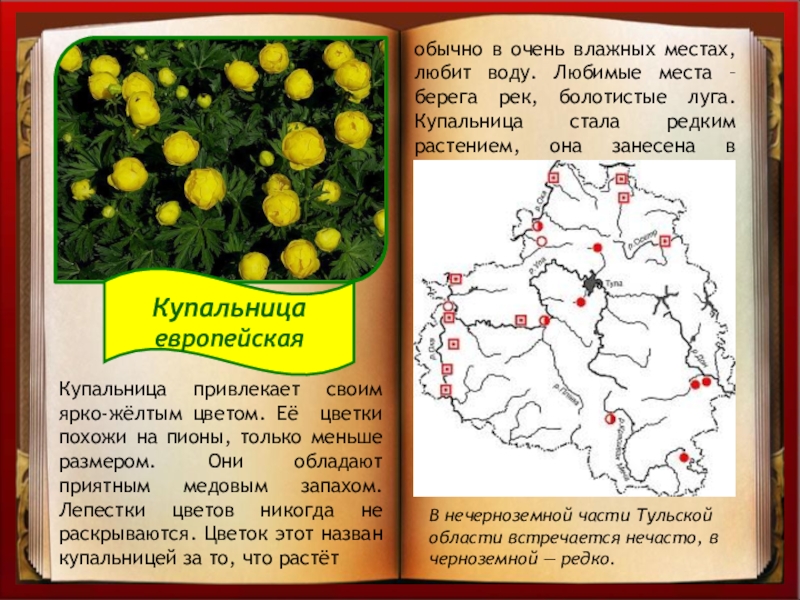 Купальница привлекает своим ярко-жёлтым цветом. Её цветки похожи на пионы, только меньше размером. Они обладают приятным медовым запахом. Лепестки цветов никогда не раскрываются. Цветок этот назван купальницей за то, что растёт