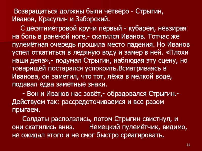 Слайд 11 Возвращаться должны были четверо - Стрыгин, Иванов, Красулин и Заборский.