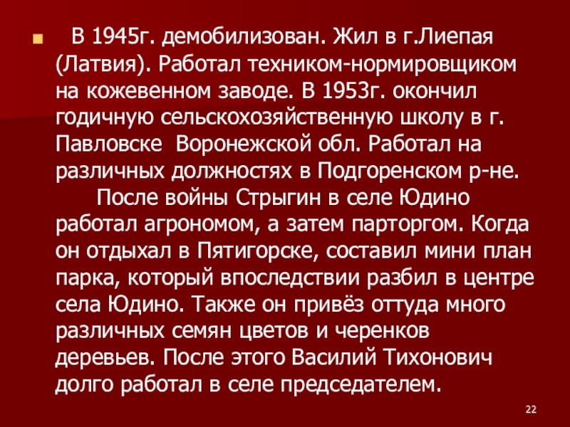 Слайд 22 В 1945г. демобилизован. Жил в г.Лиепая (Латвия). Работал техником-нормировщиком на
