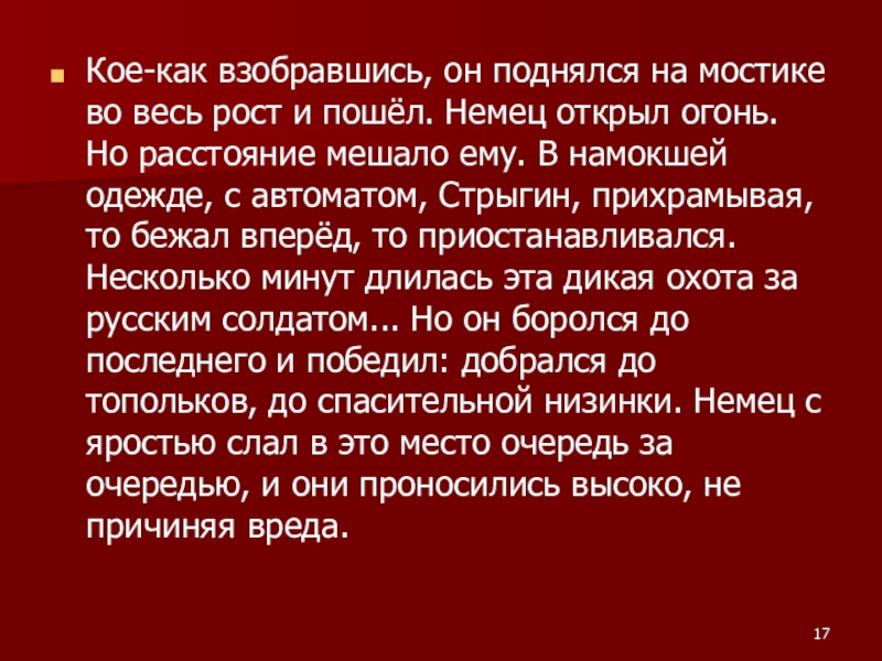 Немец открыл огонь. Но расстояние мешало ему. В намокшей одежде, с автоматом, Стрыгин, прихрамывая, то бежал вперёд, то приостанавливался. Несколько минут длилась эта дикая охота за русским солдатом... Но он боролся до последнего и победил: добрался до топольков, до спасительной низинки. Немец с яростью слал в это место очередь за очередью, и они проносились высоко, не причиняя вреда.